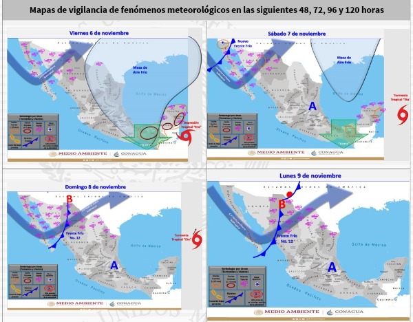 Finalmente, un nuevo frente frío se aproximará al noroeste de México e incrementará el potencial de lluvias en Baja California y Sonora, vientos con rachas fuertes con posibles tolvaneras en el noroeste de la República Mexicana.