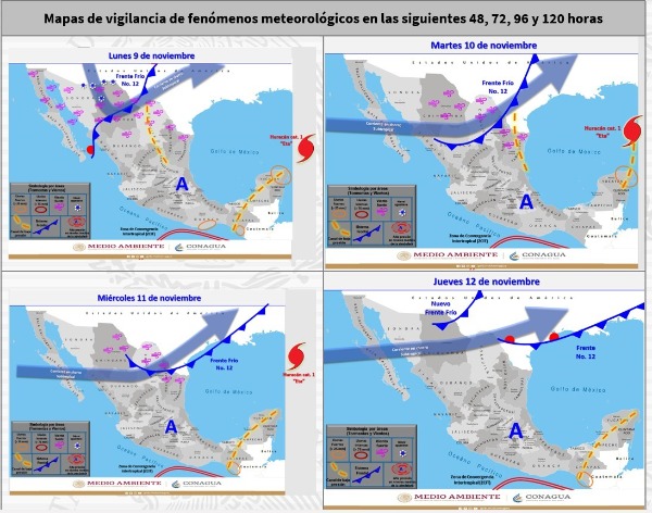 Para hoy, se pronostica que, el frente No. 12 se extenderá con características de estacionario sobre el norte de México, mantendrá condiciones para lluvias y vientos fuertes en dicha región. Por otro lado, en las próximas 24 horas Eta podría intensificarse nuevamente a huracán sobre el oriente del Golfo de México, su amplia circulación en interacción con un canal de baja presión, incrementará la probabilidad de lluvias sobre la Península de Yucatán, además de oleaje de 1 a 3 metros de altura significativa en las costas de Yucatán y Quintana Roo. Asimismo, el ingreso de humedad proveniente del Océano Pacífico y un canal de baja presión sobre el sureste del país, ocasionarán lluvias puntuales fuertes con descargas eléctricas en el sur de Oaxaca y Chiapas.