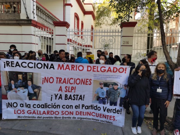 Se manifiestan simpatizantes de Francisca Reséndiz, aspirante a la candidatura de Morena a la gubernatura de San Luis Potosí en las inmediaciones del Comité Ejecutivo Nacional (CEN) de Instituto morenista en la Ciudad de México, donde arremeten contra el líder Mario Delgado por haber avalado el convenio de coalición con el PVEM en la entidad potosina.