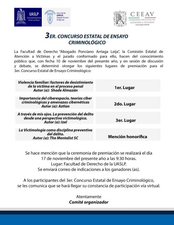 La Comisión Ejecutiva Estatal de Atención a Víctimas (CEEAV), en colaboración con la Facultad de Derecho "Abogado Ponciano Arriaga Leija" de la Universidad Autónoma de San Luis Potosí (UASLP), dieron a conocer los resultados del 3er. Concurso Estatal de Ensayo Criminológico, que en esta edición contó con la recepción de 71 trabajos.