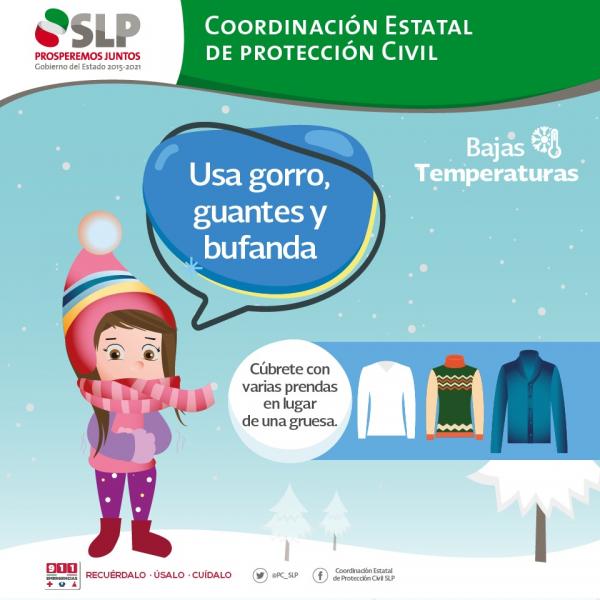 El director general de la Coordinación Estatal de Protección Civil, Ignacio Benavente Duque, informó que derivado del frente frío número 13, San Luis Potosí presentará descenso de temperatura y clima húmedo, de acuerdo a información del Servicio Meteorológico Nacional (SMN), por lo que podrían presentarse lluvias puntuales fuertes y heladas al amanecer en zonas serranas.
