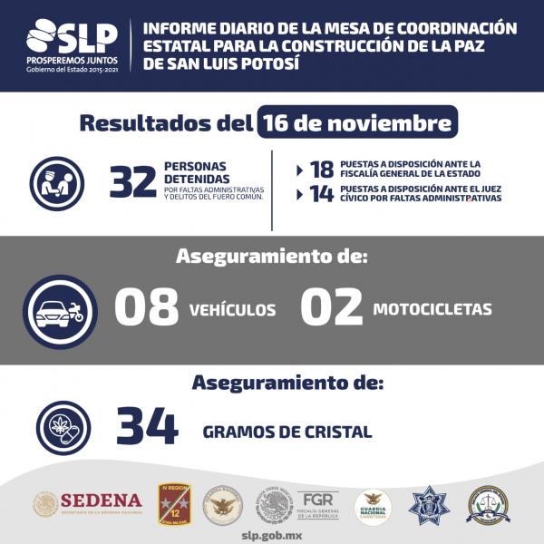 La Mesa de Coordinación Estatal para la Construcción de la Paz, informó que fueron recuperados 8 vehículos y 2 motocicletas en operativos de seguridad en las cuatro regiones de San Luis Potosí, además, 32 personas fueron detenidas por delitos del fuero común y faltas administrativas, de los que 18 quedaron a disposición de la Fiscalía General del Estado y 14 ante el juez cívico.