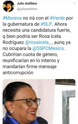 El periodista y abogado Julio Hernández López, también conocido como Julio Astillero en redes sociales, posteó que la huasteca y actual titular de la Secretaría de Seguridad Pública federal, Rosa Icela Rodríguez podría ser la elegida por Morena como candidata a la gubernatura por San Luis Potosí.
