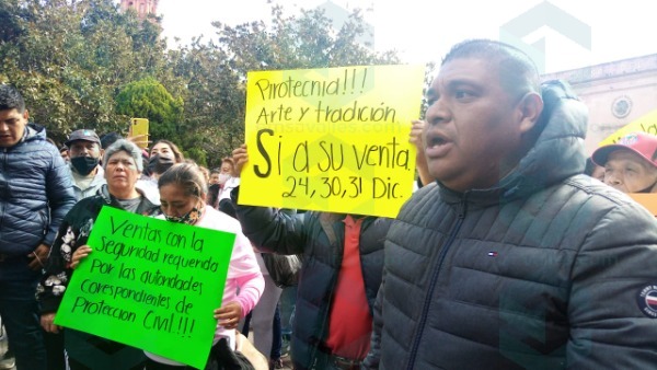 Coheteros liderados por Marco Antonio Hernández Tyson, se manifestaron este viernes afuera de Palacio de Gobierno para exigir a la autoridad sanitaria les permita la venta de sus productos durante la próximas fiestas decembrina.