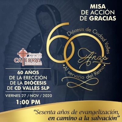 Dicho evento, será transmitido a través de las redes sociales de la Diócesis, y Catedral de Ciudad Valles, culminando con el festejo del 60 aniversario de su fundación de la misma.