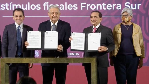 Tras dar a conocer los datos generales de este acuerdo, el Presidente de México firmó el decreto de estímulos fiscales para la frontera sur a través del cual se establece la excencion del impuesto general a importaciones, exención del cobro de derecho al trámite aduanero.