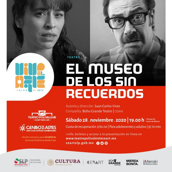 El Teatro Polivalente del Centro de las Artes de San Luis Potosí, a través del programa #VivoElArte, acciones escénicas desde casa, llevará a cabo el estreno de EL MUSEO DE LOS SIN RECUERDOS, este sábado 28 de noviembre de 2020, y FRACASO el próximo sábado 05 de diciembre, ambos trabajos audiovisuales del reconocido actor, dramaturgo y director de escena Juan Carlos Vives.