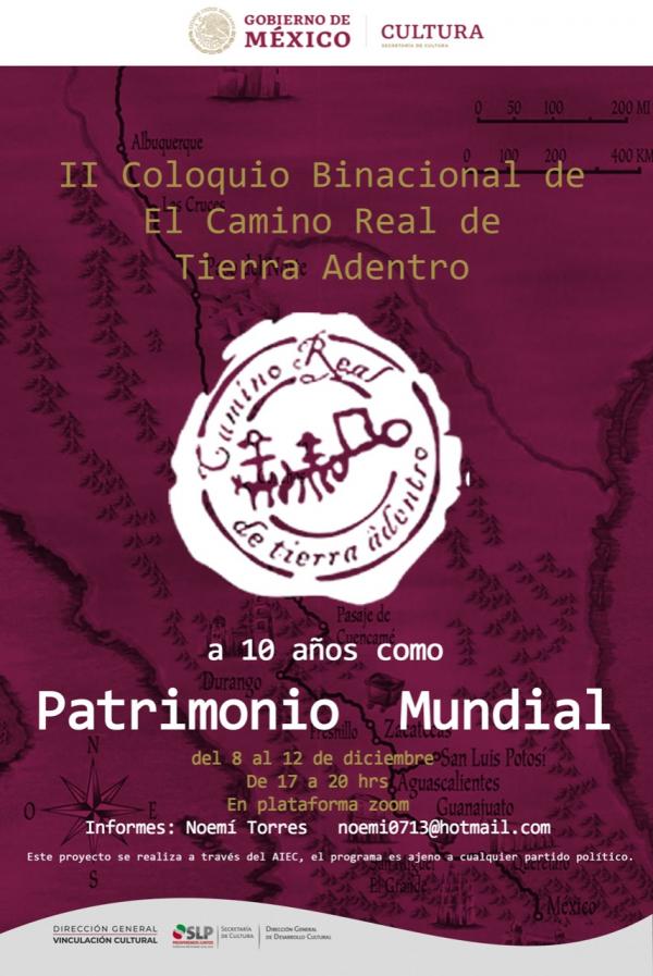 La Secretaría de Cultura de San Luis Potosí (SECULT), invita al público a participar en el Segundo Coloquio Binacional de El Camino Real de Tierra Adentro, que se llevará a cabo del 8 al 12 de diciembre de 17:00 a 20:00 horas mediante la plataforma Zoom, informó el titular de la dependencia, Armado Herrera Silva.