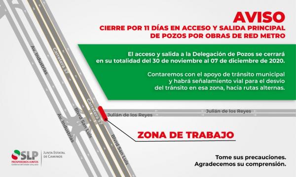 Con motivo del inicio de las obras de la Red Metro, el acceso y salida a la Delegación de Villa de Pozos estará cerrado por un periodo de 11 días, iniciando el próximo lunes 30 de noviembre, informó la titular de la Junta Estatal de Caminos (JEC), Macrina Martínez Pozos.