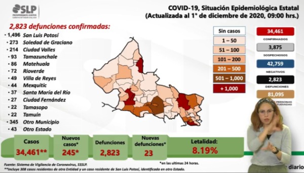 De las nuevas 23 defunciones, se dio a conocer que las víctimas corresponden a 12 mujeres y 11 hombres, con un rango de edad de 43 a 87 años, con residencia en los municipios de la capital (12); Soledad (3); Matehuala (1); Salinas (1); Ciudad del Maíz (1); Rioverde (1); Ciudad Valles (1); Tamazunchale (1); Tampacán (1); mismas que presentaban como antecedentes factores de riesgo de edad 16; hipertensión (10); diabetes (8); ninguno (4); tabaquismo (3); enfermedad pulmonar (2); obesidad (2); enfermedad renal crónica (1).