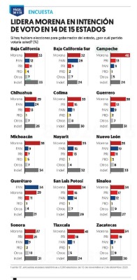De acuerdo con la encuesta realizada por El Financiero llevan ventaja en 14 entidades, exceptuando Querétaro, donde va abajo del PAN por 5 puntos.