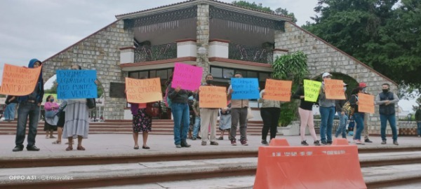 Los transportistas de Antorcha, portando pancartas se aprestaban para marchar al edificio sede del ayuntamiento exigiendo se elimine la rampa pirata y respeto a sus derechos; cuando llegaron a la Presidencia Municipal se les unieron comerciantes indígenas de su misma agrupación, quienes también con pancartas exigían más seguridad al municipio, pues han sido víctimas de por lo menos 4 robos, situación que les afecta a todos.