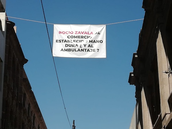Comerciantes establecidos en el primer cuadro de la ciudad colocaron lonas en diferentes puntos del Centro Histórico para exigir a la directora de la unidad de gestión, Rocío Zavala ponga orden en dicha zona comercial.