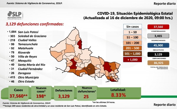 El estado de San Luis Potosí en las últimas 24 horas registra un incremento de 198 casos nuevos positivos a covid-19, coronavirus, y 25 defunciones, informó durante la rueda de prensa, el comité de seguridad en salud. Con la cifra de incrementos que se registró este jueves 17 de diciembre en territorio potosino ya se suma un acumulado de 37 mil 560 casos y 3 mil 129 defunciones.