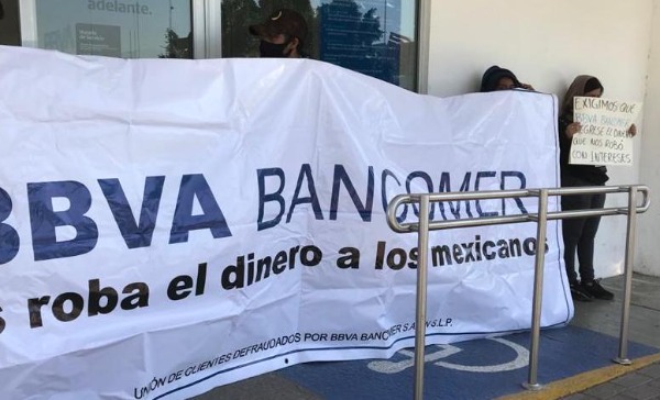 Con pancartas decenas de tarjeta habientes de Bancomer se plantaron en diferentes sucursales para exigir que les sea devuelto el dinero que supuestamente sustrajeron de sus cuentas.