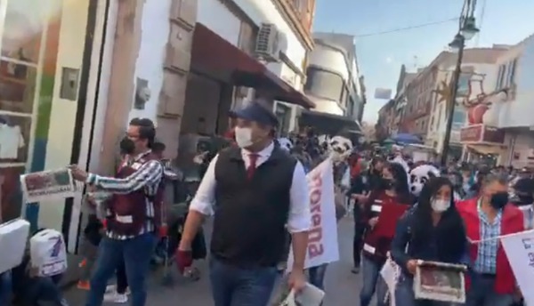 Acompaña de un grupo de simpatizantes, portando banderas de MORENA y una botarga de Andy Panda, informaba a los comerciantes que es precandidato a la gubernatura, entregaba el periódico informativo Regeneración para que la gente se informara de su propuesta.