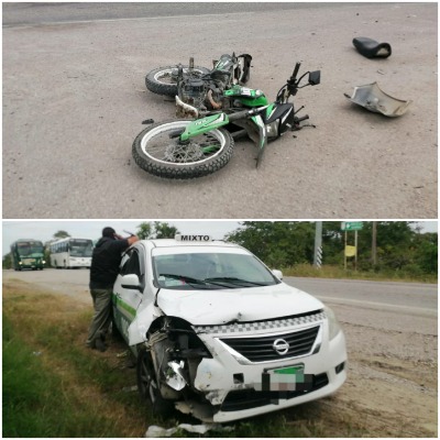La tarde de este domingo en el kilómetro 354+500 de la carretera federal 85, se registró un choque, entre un taxi con número económico 003 de la ruta Matlapa-Apanco, y una motocicleta marca Italika color verde, tipo cross.