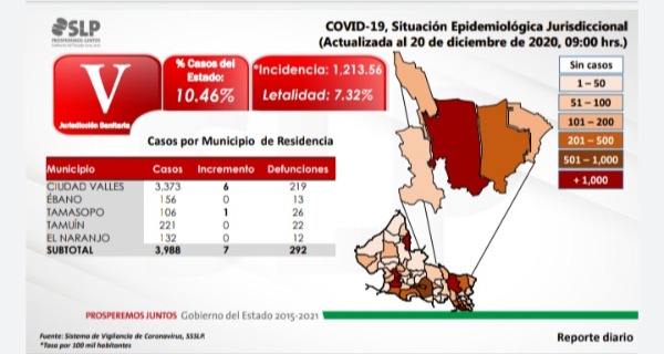 Ciudad Valles presenta al corte de este día un incremento de seis contagios para un total de 3 mil 373 pacientes y 219 víctimas mortales, una de ellas falleció en las últimas horas.
