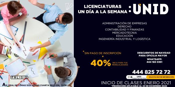 Con la finalidad de que las y los trabajadores de la administración estatal puedan concluir sus estudios de nivel superior, la Oficialía Mayor del Estado y la Universidad Interamericana para el Desarrollo (UNID), ofrecen una oferta académica de Licenciaturas un día a la semana y Licenciaturas Ejecutivas Online, además de Maestrías, sin pago de inscripción más un 40% de beca para las mensualidades, informó el Oficial Mayor del Ejecutivo Jorge Daniel Hernández Delgadillo.