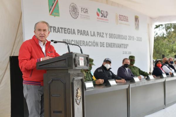 Durante el acto realizado en el Ecoparque Cráter Encantado de Armadillo de los Infante, dónde se implementaron protocolos sanitarios, el mandatario estatal, señaló que la lucha contra la producción, distribución y venta de droga, es una tarea permanente en la que es fundamental, los esfuerzos decididos de las fuerzas de seguridad de los tres órdenes de gobierno, de los poderes del Estado, así como de la sociedad, porque el aumento de la demanda ha ocasionado el crecimiento del mercado.