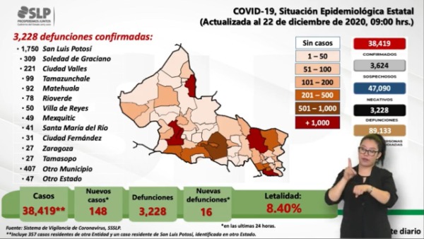 Sobre los nuevos 148 casos positivos a coronavirus, se detalló que se trata de 73 mujeres y 75 hombres, en un rango de edad de 2 a 92 años; mismos que tienen como residencia 98 en la capital; 21 en Soledad; seis en Matehuala; uno en Charcas; seis en Santa María del Río; uno en Villa Hidalgo; seis en Rioverde; cinco en Cárdenas; tres en Ciudad Valles; uno en Tampamolón.