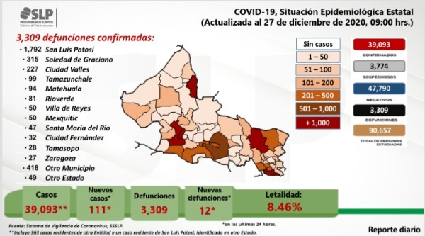 De las nuevas 12 defunciones, se dio a conocer que las víctimas corresponden a siete mujeres y cinco hombres, con un rango de edad de 30 a 90 años, con residencia en los municipios de la capital (6); Soledad (2); Santa María del Río (1); Ciudad Valles (3); mismas que presentaban como antecedentes factores de riesgo de edad (9); hipertensión (8); diabetes (5); tabaquismo (2); obesidad (2); enfermedad cardiovascular (1); enfermedad pulmonar (1); enfermedad renal crónica (1); ninguno (1).