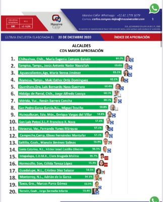 Massive Caller, casa encuestadora del expanista, Carlos Campos Riojas reveló el ranking de alcaldes con mayor y menor aprobación en el país del que resalta la mayoría emanados del Partido Acción Nacional.