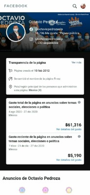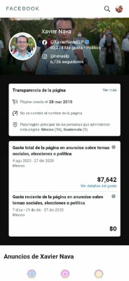 Mientras que el panista Xavier Nava Palacios de lo que va del 4 de agosto al 27 de diciembre del presente año, en el mismo rubro de la plataforma social registra un monto 7 mil 642 pesos respecto al gasto total de su página de Facebook.