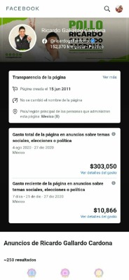 El precandidato del Partido Verde Ecologista de México (PVEM) a la gubernatura, Ricardo Gallardo Cardona, en los últimos siete días ha destinado alrededor de 10 mil 866 pesos para promocionar su imagen en la red social, facebook, lo anterior según la información de su página oficial, Ricardo Gallardo Cardona, dato que se especifica en el rubro de gasto total de la página en anuncios sobre temas sociales, elecciones o política.