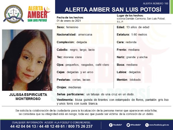 Cualquier información sobre su paradero, favor de acudir a la FGESLP, en su edificio Central de Eje Vial 100, en la zona Centro de San Luis Potosí, o comunicarse a los teléfonos 444 812 49 61 y/o al 800 7526237 lada sin costo.