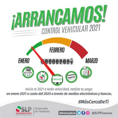 El pago de control vehicular se podrá realizar del mes de enero hasta el mes de marzo sin multas ni recargos. De manera sencilla pueden realizar su pago a través de la aplicación móvil "SLP Finanzas", el Sitio web slpfinanzas.gob.mx, 16 Centros Electrónicos ubicados en plazas comerciales, oficinas y presidencias municipales, así como en la línea telefónica 800 711 7078 y sucursales bancarias.