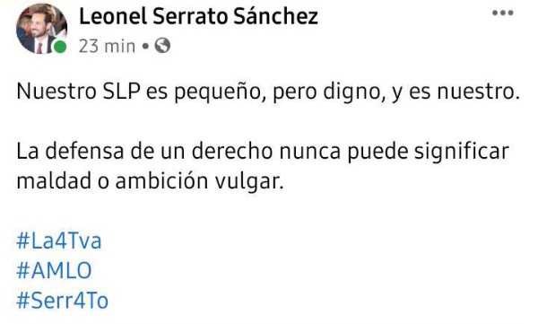 "Decidí controvertir legalmente la anulación de hecho de nuestro proceso intrapartidario con el grave acento, por parte de la cúpula nacional del partido, de la arbitrariedad, la unilateralidad, la falta de competencia y el desprecio por la voluntad de la militancia y simpatizantes de Morena en San Luis Potosí", posteo en redes sociales.