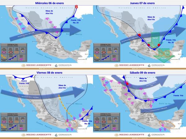 Para hoy, se pronostica que, el nuevo frente frío No. 25 se desplazará sobre el norte y noreste del país y, en interacción con un canal de baja presión sobre el sureste de México, originará chubascos que podrían acompañarse de descargas eléctricas sobre el noreste, oriente y sureste del Territorio Nacional.