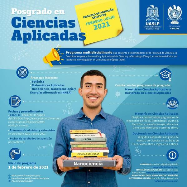 Este Posgrado cuenta con dos programas como son Maestría en Ciencias Aplicadas y Doctorado en Ciencias Aplicadas y está conformado por áreas como la Fotónica, Matemáticas Aplicadas, Nanociencia, Nanotecnología y Energías Alternativas.