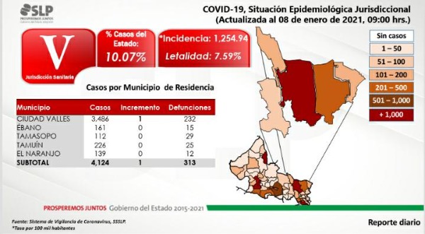 Ciudad Valles presenta al corte de este día un incremento de un contagios para un total de 3 mil 486 pacientes y 232 víctimas mortales, dos de ellas fallecieron en las últimas horas.