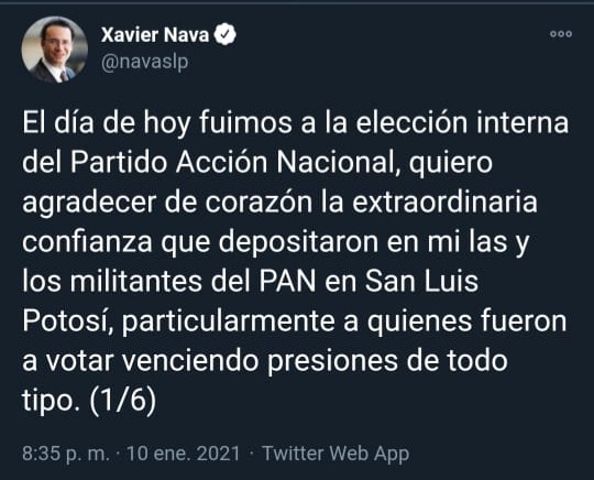 "Nada ni nadie habrá de detener el esfuerzo conjunto y compartido por la búsqueda de un San Luis con dignidad, justicia y democracia" expresó Xavier Nava Palacios en su red social, mismo que añadió que en próximos días informará la desición que tomara.