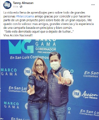 Tras darse a conocer resultados preliminares, en el que Octavio Pedroza Gaitán, fuera elegido por los panistas como el candidato a la gubernatura, la también militante del albiazul, originaria de Tamuín, Liliana Flores Almazán, a través de redes sociales, refrendó una vez más el apoyo total al senador con licencia, Marco Antonio Gama Basarte, quien participara en la contienda interna del partido.