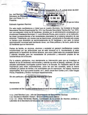 Luego de que padres de familia dieran a conocer que el presidente municipal de SAN Vicente Tancuayalab, Josué Soni Cortés, busca despojar de 22 hectáreas a la Escuela Secundaria Técnica número 7, para fraccionar y vender estos terrenos, o en su caso, algunos donarlos, los inconformes hicieron llegar a la Secretaría de Educación del Gobierno del Estado (SEGE) un oficio en el que solicitan la intervención del titular de la dependencia, Joel Ramírez Díaz.