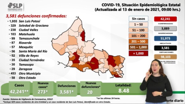 La cifra del acumulado total en la entidad potosina asciende a los 42 mil 241 casos y 3 mil 581 decesos por esta causa