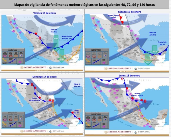 Finalmente, durante el sábado, el Frente Frío Número 27 recorrerá el sureste del país y la Península de Yucatán, en su avance ocasionará potencial de chubascos y lluvias puntuales fuertes sobre dichas regiones. La masa de aire frío asociada al frente, mantendrá ambiente frío a muy frío en gran parte de la República Mexicana, así como ambiente muy frío a gélido y heladas matutinas sobre entidades de la Mesa del Norte y Mesa Central. A su vez, continuará el evento de Norte sobre el litoral de del Golfo de México, Istmo y Golfo de Tehuantepec. Se prevé que, durante el domingo, el frente frío ingrese al Mar Caribe y deje de afectar al territorio nacional.