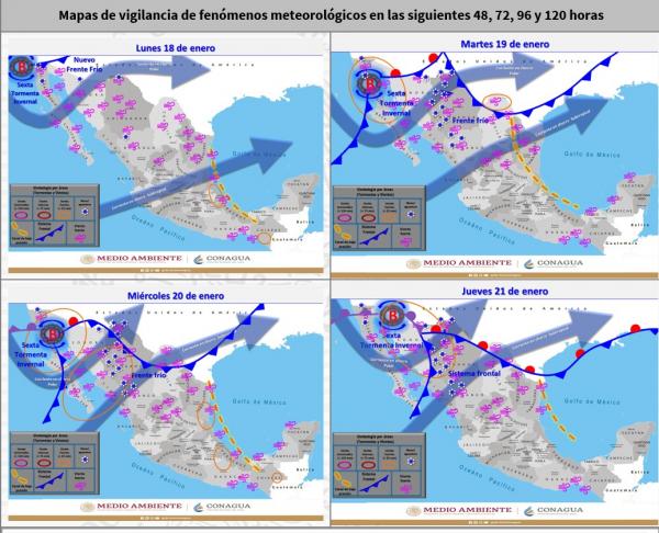 Finalmente, durante el periodo del pronóstico, la Sexta Tormenta Invernal de la temporada, en interacción con el nuevo frente frío (No. 29) y con el arrastre de humedad de un río atmosférico, ocasionarán ambiente frío a muy frío, lluvias fuertes a muy fuertes, vientos intensos y tolvaneras sobre entidades del noroeste y norte del país.