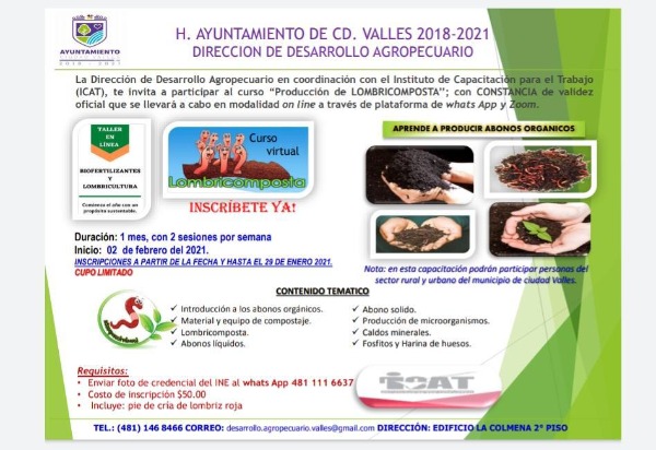 Con la finalidad de otorgar estrategias para el impulso de la productividad Carlos Martínez Guerrero, Director de Desarrollo Agropecuario y el Instituto de Capacitación para el Trabajo (ICAT), ofrecerán un curso de producción de lombricomposta, con constancia de validación oficial mismo que será impartido en línea.