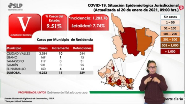 Ciudad Valles presenta al corte de este día un incremento de 10 contagios para un total de 3 mil 584 pacientes y 244 víctimas mortales, una de ellas falleció en las últimas horas.