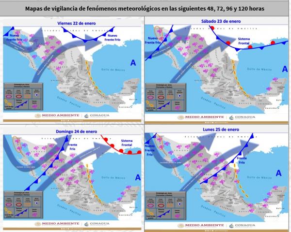 Finalmente, durante el periodo del pronóstico un nuevo frente frío recorrerá el noroeste, norte y noreste de la República Mexicana, en interacción con un fuerte pulso de la corriente en chorro polar, ocasionará un nuevo descenso de las temperaturas y vientos intensos con tolvaneras sobre dichas regiones, así como chubascos y lluvias fuertes en el noroeste del país.