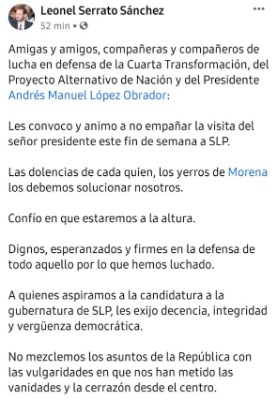 Les convoco y animo a no empañar la visita del señor presidente este fin de semana a SLP.