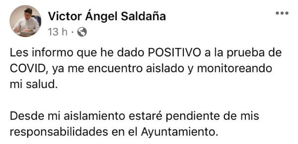 "Les informo que he dado positivo a la prueba de Covid, ya me encuentro aislado y monitoreo mi salud, desde mi aislamiento estaré pendiente de mis actividades en el Ayuntamiento".