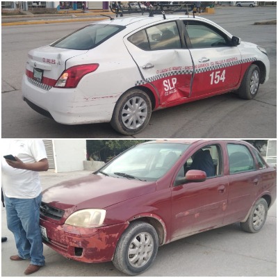 Un vehículo Chevrolet Corsa color guinda, le pegó en un costado a un vehículo Nissan Versa color blanco y rojo, usado para el transporte público de la ruta Valles-Laguna del Mante.