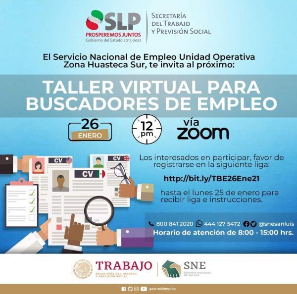 La Secretaría del Trabajo y Previsión Social del Gobierno del Estado (STPS), convoca para este próximo 26 de enero al "taller virtual para buscadores de empleo", que organiza el Servicio Nacional de Empleo, a través de la Unidad Operativa Huasteca Sur y que tiene por objetivo otorgar las herramientas necesarias para que hombres y mujeres de la región, se incrusten de manera más efectiva al sector productivo.