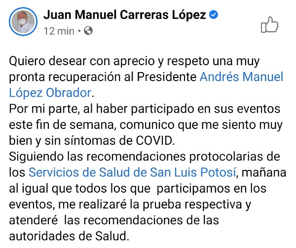 El Gobernador del Estado, Juan Manuel Carreras López anunció en redes sociales que será el día de mañana cuando se haga la prueba para detectar el virus del Covid-19, para posteriormente atender las recomendaciones de las autoridades sanitarias.
