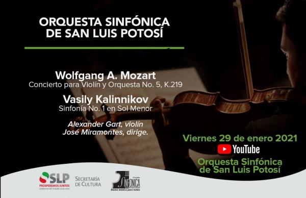 Para cerrar el mes de enero, la Orquesta Sinfónica del Estado recordará un concierto integrado con obras de W. A. Mozart y Vasily Kalinnikov que realizó en el Teatro de la Paz en 2012, como parte de la programación virtual #CulturaVivaEnCasa, que presenta la Secretaría de Cultura durante la contingencia sanitaria y que estará disponible gratuitamente a través del canal de YouTube de la OSSLP a partir del viernes 29 de enero, informó el titular de dependencia, Armando Herrera Silva.